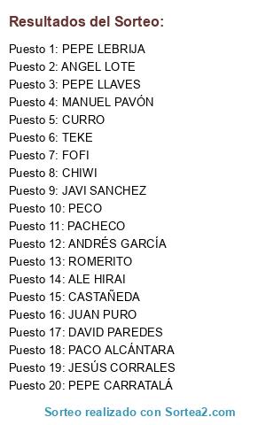Lista de participantes: ANGEL LOTE, PEPE LLAVES, ANDRÉS GARCÍA, CASTAÑEDA, JUAN PURO, JAVI SANCHEZ, CHIWI, ROMERITO, PEPE CARRATALÁ, CURRO, FOFI, MANUEL PAVÓN, ALE HIRAI, PECO, PACHECO, DAVID PAREDES, JESÚS CORRALES, TEKE, PACO ALCÁNTARA, PEPE LEBRIJA.