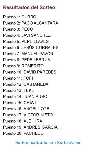 Lista de participantes: DAVID PAREDES, CHIWI, ROMERITO, PEPE LLAVES, VICTOR NIETO, CURRO, ANDRÉS GARCÍA, JUAN PURO, JESÚS CORRALES, ALE HIRAI, PACHECO, TEKE, FOFI, ANGEL LOTE, PEPE LEBRIJA, PECO, PACO ALCÁNTARA, MANUEL PAVÓN, JAVI SÁNCHEZ, CASTAÑEDA.