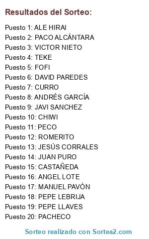 Lista de participantes: MANUEL PAVÓN, PECO, FOFI, CURRO, PEPE LLAVES, ALE HIRAI, ROMERITO, PACO ALCÁNTARA, ANGEL LOTE, JESÚS CORRALES, JAVI SANCHEZ, CASTAÑEDA, PACHECO, JUAN PURO, ANDRÉS GARCÍA, DAVID PAREDES, CHIWI, TEKE, VICTOR NIETO, PEPE LEBRIJA.