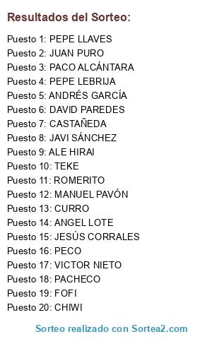 Lista de participantes: PECO, CURRO, TEKE, PEPE LEBRIJA, JAVI SÁNCHEZ, FOFI, ALE HIRAI, MANUEL PAVÓN, ANGEL LOTE, JUAN PURO, PACHECO, PEPE LLAVES, VICTOR NIETO, CASTAÑEDA, JESÚS CORRALES, DAVID PAREDES, CHIWI, ANDRÉS GARCÍA, ROMERITO, PACO ALCÁNTARA.