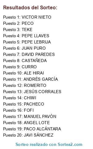 Lista de participantes: CHIWI, CASTAÑEDA, MANUEL PAVÓN, PACHECO, ALE HIRAI, PACO ALCÁNTARA, JUAN PURO, JESÚS CORRALES, CURRO, DAVID PAREDES, JAVI SÁNCHEZ, PEPE LEBRIJA, ANDRÉS GARCÍA, PECO, TEKE, VICTOR NIETO, ROMERITO, ANGEL LOTE, PEPE LLAVES, FOFI.
