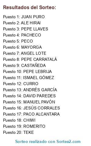 Lista de participantes: CHIWI, JUAN PURO, ISMAEL GÓMEZ, ROMERITO, ANGEL LOTE, MANUEL PAVÓN, PECO, PACO ALCANTARA, DAVID PAREDES, TEKE, ALE HIRAI, MAYORGA, JESÚS CORRALES, PEPE LLAVES, PACHECO, ANDRÉS GARCÍA, CASTAÑEDA, CURRO, PEPE CARRATALÁ, PEPE LEBRIJA.
