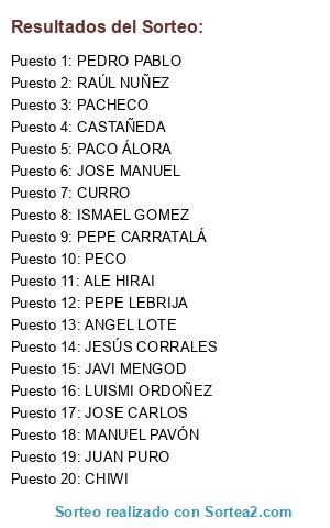 Lista de participantes: ISMAEL GOMEZ, LUISMI ORDOÑEZ, ANGEL LOTE, JESÚS CORRALES, PECO, JAVI MENGOD, JUAN PURO, PEDRO PABLO, CHIWI, MANUEL PAVÓN, PACO ÁLORA, PACHECO, JOSE CARLOS, PEPE LEBRIJA, JOSE MANUEL, PEPE CARRATALÁ, RAÚL NUÑEZ, ALE HIRAI, CASTAÑEDA, CURRO.