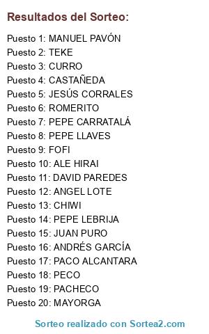 Lista de participantes: ANDRÉS GARCÍA, DAVID PAREDES, PEPE CARRATALÁ, CHIWI, PEPE LLAVES, CASTAÑEDA, PACHECO, JUAN PURO, PACO ALCANTARA, ANGEL LOTE, PEPE LEBRIJA, MAYORGA, ALE HIRAI, TEKE, JESÚS CORRALES, ROMERITO, CURRO, MANUEL PAVÓN, FOFI, PECO.