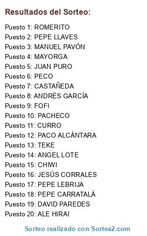 Lista de participantes: TEKE, MANUEL PAVÓN, CASTAÑEDA, CURRO, PEPE LLAVES, JESÚS CORRALES, PEPE CARRATALÁ, ROMERITO, ANGEL LOTE, CHIWI, PACHECO, ALE HIRAI, DAVID PAREDES, PEPE LEBRIJA, PECO, FOFI, MAYORGA, JUAN PURO, ANDRÉS GARCÍA, PACO ALCÁNTARA.