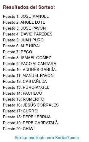 Lista de participantes: PECO, ANGEL LOTE, MANUEL PAVÓN, CURRO, PEPE LEBRIJA, CHIWI, PURO-ANGEL, ANDRÉS GARCÍA, DAVID PAREDES, JUAN PURO, JOSE MANUEL, ISMAEL GOMEZ, CASTAÑEDA, ALE HIRAI, PACHECO, JOSE PAVÓN, PACO ALCANTARA, PEPE CARRATALÁ, JESÚS CORRALES, ROMERITO.