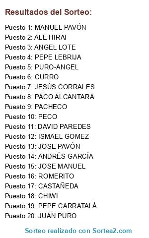Lista de participantes: JESÚS CORRALES, JOSE MANUEL, JUAN PURO, JOSE PAVÓN, PECO, CURRO, CHIWI, ALE HIRAI, PACO ALCANTARA, PURO-ANGEL, PEPE CARRATALÁ, ANGEL LOTE, ROMERITO, CASTAÑEDA, PACHECO, ANDRÉS GARCÍA, MANUEL PAVÓN, DAVID PAREDES, ISMAEL GOMEZ, PEPE LEBRIJA.