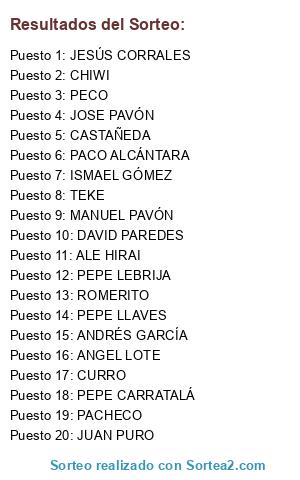 Lista de participantes: MANUEL PAVÓN, CHIWI, DAVID PAREDES, ISMAEL GÓMEZ, PACO ALCÁNTARA, CURRO, ANDRÉS GARCÍA, CASTAÑEDA, ANGEL LOTE, PECO, PEPE LLAVES, TEKE, ROMERITO, JUAN PURO, ALE HIRAI, PEPE LEBRIJA, PEPE CARRATALÁ, JOSE PAVÓN, JESÚS CORRALES, PACHECO.