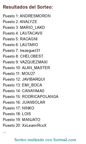 Lista de participantes: trezeguet31, XxLeannRcxX, ANTHOXDDD, EMI_BOCA, LAUTACAVS, LAUTARO, MANJATO, VAZQUEZMAXI, RIALICE, MOU27, CARP, ALAN_MASTER, CHELOBEST, MARTINCHO, CANAYA4A0, FEDECARP, MARIO30, LEITODMC, JAVIBARQUI, ARKUAN, NINKO, RACAGNI, SERGIOCABJ, JUANSOLAR, MAXITOREX1, ANDRESMORON, LOIS, ANALYZE, MARIO_LAKD, RODRICAPOLANGA, JORGEMELER.