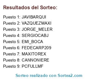 Lista de participantes: VAZQUEZMAXI, FEDECARP209, JAVIBARQUI, JORGE_MELER, CANNONIERE, SERGIOCABJ, EMI_BOCA, PCFULLMF, MAXITOREX.