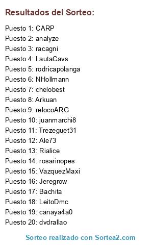 Lista de participantes: LeitoDmc, dvdrallao, NHollmann, Arkuan, Jeregrow, analyze, LautaCavs, rodricapolanga, Trezeguet31, VazquezMaxi, Ale73, racagni, chelobest, CARP, relocoARG, juanmarchi8, rosarinopes, Bachita, Rialice, canaya4a0.