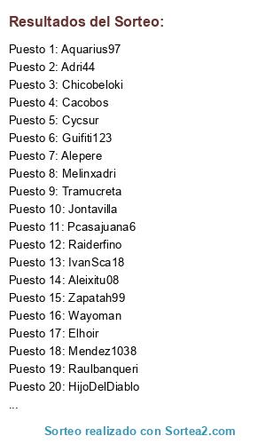 Lista de participantes: Adri44, AlbertoPantani, Aleixitu08, Alepere, Aquarius97, BmfyPc11, Cacobos, Chicobeloki, Cycsur, Elhoir, Guifiti123, HijoDelDiablo, IvanSca18, Jontavilla, Melinxadri, Mendez1038, Mrurrego, Pcasajuana6, Raiderfino, Raulbanqueri, Ratziel, Tramucreta, Wayoman, Zapatah99.