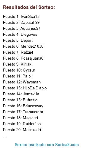 Lista de participantes: Adri44, AlbertoPantani, Aleixitu08, Alepere, Aquarius97, Cycsur, Deport, Diegovos, Elhoir, Eufrasio, Educosway, Guifiti123, HijoDelDiablo, Ipom, IvanSca18, Jontavilla, Kirilak, Magicuri, Melinxadri, Mendez1038, Migsiemar99, Palbi, Pcasajuana6, Raiderfino, Raulbanqueri, Ratziel, Tramucreta, Wayoman, Zapatah99.