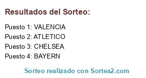 Lista de participantes: CHELSEA, BAYERN, VALENCIA, ATLETICO.