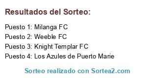 Lista de participantes: Los Azules de Puerto Marie, Weeble FC, Knight Templar FC, Milanga FC.