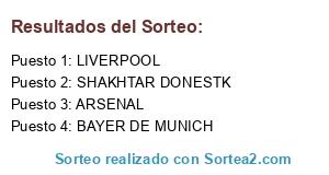 Lista de participantes: ARSENAL, BAYER DE MUNICH, SHAKHTAR DONESTK, LIVERPOOL.