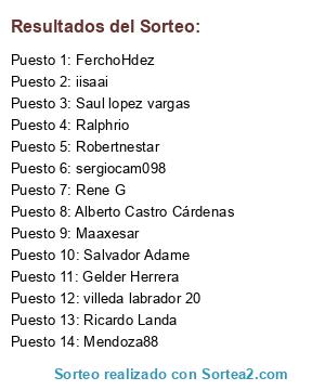 Lista de participantes: sergiocam098, Ricardo Landa, Salvador Adame, Robertnestar, iisaai, Alberto Castro Cárdenas, Maaxesar, Gelder Herrera, Saul lopez vargas, FerchoHdez, Rene G, Ralphrio, villeda labrador 20, Mendoza88.