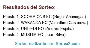 Lista de participantes: WAKANDA FC (Valenttino Casanova), SCORPIONS FC (Roger Arciniegas), MUSLIM FC (Juan Silva), UNITEDLEO (Andres Espitia).