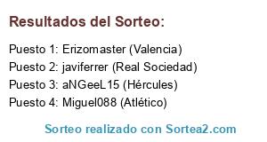 Lista de participantes: javiferrer (Real Sociedad), Miguel088 (Atlético), aNGeeL15 (Hércules), Erizomaster (Valencia).