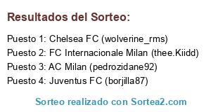 Lista de participantes: FC Internacionale Milan (thee.Kiidd), AC Milan (pedrozidane92), Chelsea FC (wolverine_rms), Juventus FC (borjilla87).