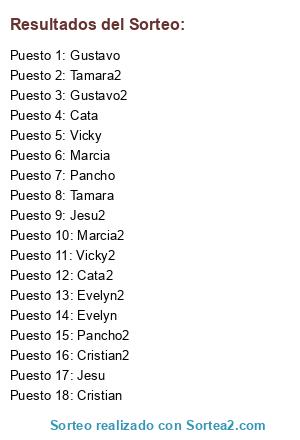 Lista de participantes: Evelyn, Evelyn2, Cata, Cata2, Vicky, Vicky2, Jesu, Jesu2, Marcia, Marcia2, Tamara, Tamara2, Gustavo, Gustavo2, Cristian, Cristian2, Pancho, Pancho2.