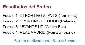 Lista de participantes: LEVANTE UD (Celtics Fan), REAL MADRID (Ivan Zamorano), SPORTING DE GIJON (Rebekin), DEPORTIVO ALAVES (Torressss).