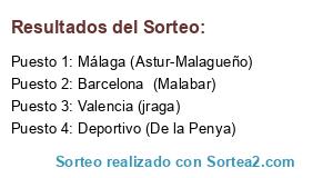 Lista de participantes: Barcelona (Malabar), Málaga (Astur-Malagueño), Valencia (jraga), Deportivo (De la Penya).