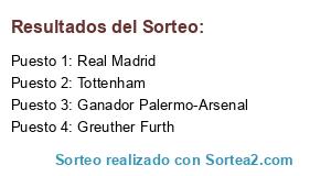 Lista de participantes: Tottenham, Greuther Furth, Real Madrid, Ganador Palermo-Arsenal.