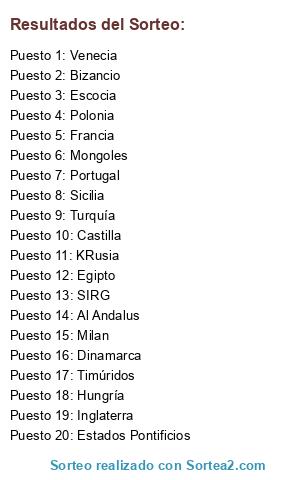 Lista de participantes: Estados Pontificios, Mongoles, Inglaterra, Francia, SIRG, Castilla, Venecia, Sicilia, Milan, Escocia, Bizancio, KRusia, Al Andalus, Turquía, Egipto, Dinamarca, Portugal, Polonia, Hungría, Timúridos.