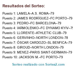 Lista de participantes: LLORENTE–ATHLETIC CLUB–79, JACKSON M.–FC PORTO–79, PEDRO–FC BARCELONA–79, LAMELA–A.S. ROMA–79, GIROUD–NORTH LONDON–79, IARMOLENKO–FC DYNAMO KYIV–79, JAMES RODRÍGUEZ–FC PORTO–79, MENEZ–PARIS SAINT-GERMAIN–79, ÓSCAR CARDOZO–SL BENFICA–79, GERVINHO–NORTH LONDON–78.