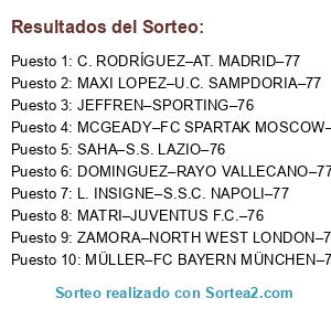 Lista de participantes: L. INSIGNE–S.S.C. NAPOLI–77, DOMINGUEZ–RAYO VALLECANO–77, MAXI LOPEZ–U.C. SAMPDORIA–77, C. RODRÍGUEZ–AT. MADRID–77, ZAMORA–NORTH WEST LONDON–77, MÜLLER–FC BAYERN MÜNCHEN–76, MCGEADY–FC SPARTAK MOSCOW–76, JEFFREN–SPORTING–76, MATRI–JUVENTUS F.C.–76, SAHA–S.S. LAZIO–76.