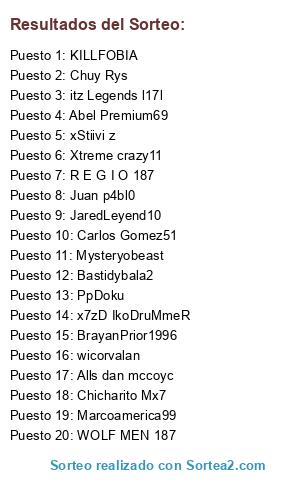 Lista de participantes: Chuy Rys, Chicharito Mx7, JaredLeyend10, Xtreme crazy11, itz Legends l17l, Alls dan mccoyc, Abel Premium69, wicorvalan, KILLFOBIA, BrayanPrior1996, Carlos Gomez51, Mysteryobeast, Juan p4bl0, x7zD IkoDruMmeR, R E G I O 187, xStiivi z, Marcoamerica99, WOLF MEN 187, Bastidybala2, PpDoku.