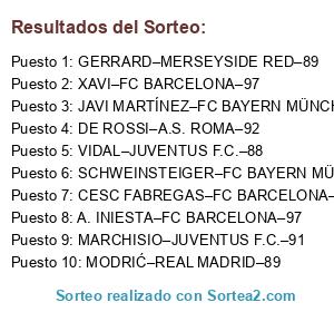 Lista de participantes: A. INIESTA–FC BARCELONA–97, XAVI–FC BARCELONA–97, CESC FABREGAS–FC BARCELONA–95, DE ROSSI–A.S. ROMA–92, MARCHISIO–JUVENTUS F.C.–91, MODRIĆ–REAL MADRID–89, SCHWEINSTEIGER–FC BAYERN MÜNCHEN–89, GERRARD–MERSEYSIDE RED–89, JAVI MARTÍNEZ–FC BAYERN MÜNCHEN–88, VIDAL–JUVENTUS F.C.–88.