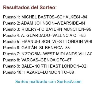 Lista de participantes: RIBÉRY–FC BAYERN MÜNCHEN–95, BALE–NORTH EAST LONDON–92, HAZARD–LONDON FC–89, VARGAS–GENOA CFC–87, N'ZOGBIA–WEST MIDLANDS VILLAGE–86, EMANUELSON–WEST LONDON WHITE–85, GAITÁN–SL BENFICA–85, ADAM JOHNSON–WEARSIDE–84, MICHEL BASTOS–SCHALKE04–84, A. GUARDADO–VALENCIA CF–83.