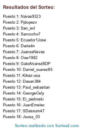Lista de participantes: JuanEmelec, GaloAlvarezBDP, Dariielin, Osw1982, GeorgeCely, Kikez-usa, Dasan384, San_evl, JuanseNavas, Daniel_suarez85, El_pedroski, Jsosa_03, Pplopezv, Paul_sebastian, SDassum47, Navas9323, Ecuador1Jose, Sancocho7.