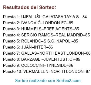 Lista de participantes: VERMAELEN–NORTH LONDON–87, COLOCCINI–TYNESIDE–86, GALLAS–NORTH EAST LONDON–86, JUAN–INTER–86, BARZAGLI–JUVENTUS F.C.–85, SERGIO RAMOS–REAL MADRID–85, HUMMELS–FREE AGENTS–85, ROLANDO–S.S.C. NAPOLI–85, IVANOVIĆ–LONDON FC–85, UJFALUŠI–GALATASARAY A.S.–84.