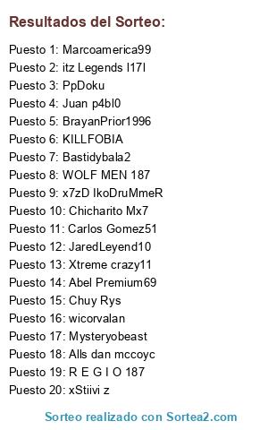Lista de participantes: Chuy Rys, Chicharito Mx7, JaredLeyend10, Xtreme crazy11, itz Legends l17l, Alls dan mccoyc, Abel Premium69, wicorvalan, KILLFOBIA, BrayanPrior1996, Carlos Gomez51, Mysteryobeast, Juan p4bl0, x7zD IkoDruMmeR, R E G I O 187, xStiivi z, Marcoamerica99, WOLF MEN 187, Bastidybala2, PpDoku.