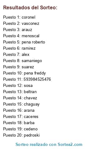 Lista de participantes: alex, chavez, arana, suarez, caceres, pena freddy, coronel, sosa, arauz, chaguay, ramirez, barba, vasconez, samaniego, pena roberto, cedeno, beltran, menoscal, 593984525476, pedroski.