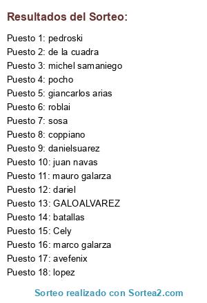 Lista de participantes: Cely, danielsuarez, dariel, pedroski, GALOALVAREZ, juan navas, batallas, mauro galarza, avefenix, lopez, coppiano, sosa, de la cuadra, michel samaniego, roblai, pocho, marco galarza, giancarlos arias.