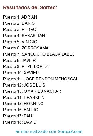 Lista de participantes: ADRIAN, DARIO, DAVID, EMILIO, FRANKLIN, HONNING, JOSE RENDON MENOSCAL, JOSE LUIS, JAVIER, OMAR BUMACHAR, PAUL, PEDRO, PEPE LOPEZ, SANCOCHO BLACK LABEL, SEBASTIAN, VINICIO, XAVIER, ZORROSAMA.