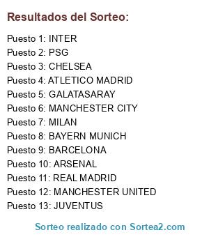 Lista de participantes: MILAN, JUVENTUS, BAYERN MUNICH, REAL MADRID, BARCELONA, CHELSEA, MANCHESTER CITY, MANCHESTER UNITED, PSG, ARSENAL, ATLETICO MADRID, GALATASARAY, INTER.