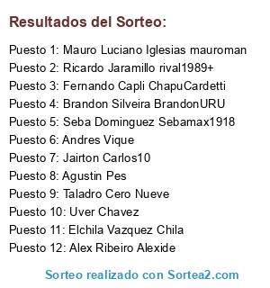 Lista de participantes: andres vique, mauro luciano iglesias, jairton carlos, agustin pes, seba dominguez, elchila vazquez, brandonsilveira, fernando capli, ricardo jaramillo, alex ribeiro, taladro09, uver chavez.