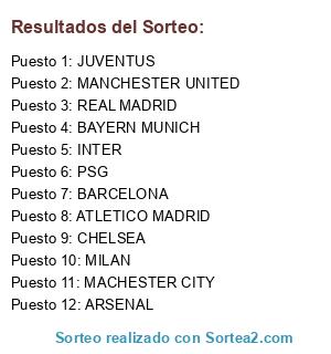 Lista de participantes: REAL MADRID, MACHESTER CITY, ARSENAL, CHELSEA, PSG, JUVENTUS, MILAN, BAYERN MUNICH, MANCHESTER UNITED, BARCELONA, INTER, ATLETICO MADRID.