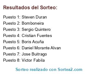 Lista de participantes: Daniel Morante Alvan, Cristian Fuentes, Boris Acuña, Steven Duran, Jose Buitrago, Victor Fabila, Bomboneira, Sergio Quintero.