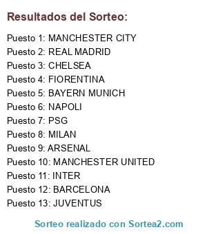 Lista de participantes: CHELSEA, MANCHESTER CITY, MANCHESTER UNITED, PSG, BAYERN MUNICH, JUVENTUS, NAPOLI, MILAN, INTER, FIORENTINA, REAL MADRID, ARSENAL, BARCELONA.