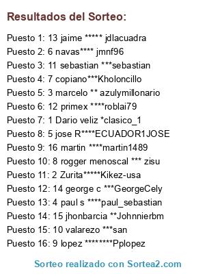 Lista de participantes: 1 Dario veliz *clasico_1, 2 Zurita*****Kikez-usa, 3 marcelo ** azulymillonario, 4 paul s ****paul_sebastian, 5 jose R****ECUADOR1JOSE, 6 navas**** jmnf96, 7 copiano***Kholoncillo, 8 rogger menoscal *** zisu, 9 lopez ********Pplopez, 10 valarezo ***san, 11 sebastian ***sebastian, 12 primex ****roblai79, 13 jaime ***** jdlacuadra, 14 george c ***GeorgeCely, 15 jhonbarcia **Johnnierbm, 16 martin ****martin1489.
