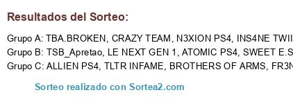 Lista de participantes: LE NEXT GEN 1, CRAZY TEAM, ALLIEN PS4, SWEET E.SPORTS, N3XION PS4, FR3NETIIC, TLTR INFAME, ATOMIC PS4, INS4NE TWIIST, BROTHERS OF ARMS, TSB_Apretao, TBA.BROKEN.