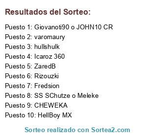 Lista de participantes: CHEWEKA, HellBoy MX, varomaury, Icaroz 360, SS SChutze o Meleke, Fredsion, ZaredB, Rizouzki, hullshulk, Giovanoti90 o JOHN10 CR.