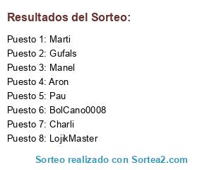 Lista de participantes: BolCano0008, LojikMaster, Charli, Manel, Marti, Pau, Gufals, Aron.