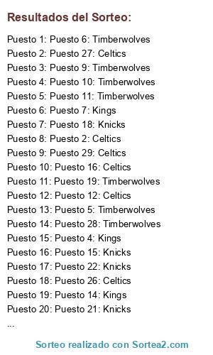 Lista de participantes: Puesto 1: Timberwolves, Puesto 2: Celtics, Puesto 3: Celtics, Puesto 4: Kings, Puesto 5: Timberwolves, Puesto 6: Timberwolves, Puesto 7: Kings, Puesto 8: Kings, Puesto 9: Timberwolves, Puesto 10: Timberwolves, Puesto 11: Timberwolves, Puesto 12: Celtics, Puesto 13: Celtics, Puesto 14: Kings, Puesto 15: Knicks, Puesto 16: Celtics, Puesto 17: Kings, Puesto 18: Knicks, Puesto 19: Timberwolves, Puesto 20: Timberwolves, Puesto 21: Knicks, Puesto 22: Knicks, Puesto 23: Timberwolves, Puesto 24: Knicks, Puesto 25: Celtics, Puesto 26: Celtics, Puesto 27: Celtics, Puesto 28: Timberwolves, Puesto 29: Celtics, Puesto 30: Kings.
